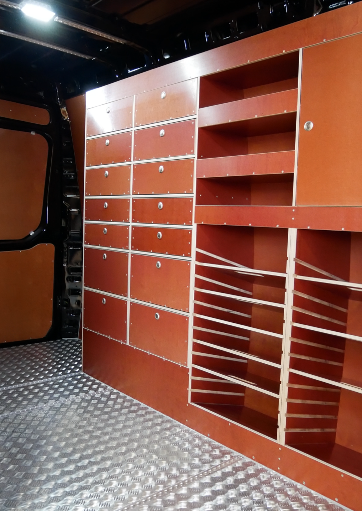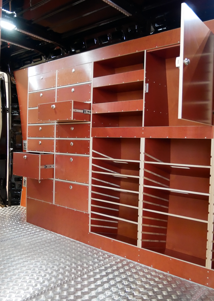 (à la demande du client) en contreplaqué filmé brun contenant placard, étagères et des tiroirs éclairé pas des spots led.